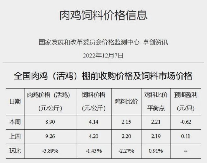 2022年12月第1周全國雞料比價為2.15,環比下降2.27%。按目前價格及成本推算,未來肉雞養殖預期虧損為0.62元/只。本周終端市場需求減少,屠宰企業計劃收購量降低,而周內毛雞出欄量相對集中,走貨速度不快,毛雞均價下跌。下周產品市場表現較為平淡,屠宰企業計劃收購量有限,但毛雞出欄量減少,走貨速度大致趨穩,預計毛雞價格或以穩為主。