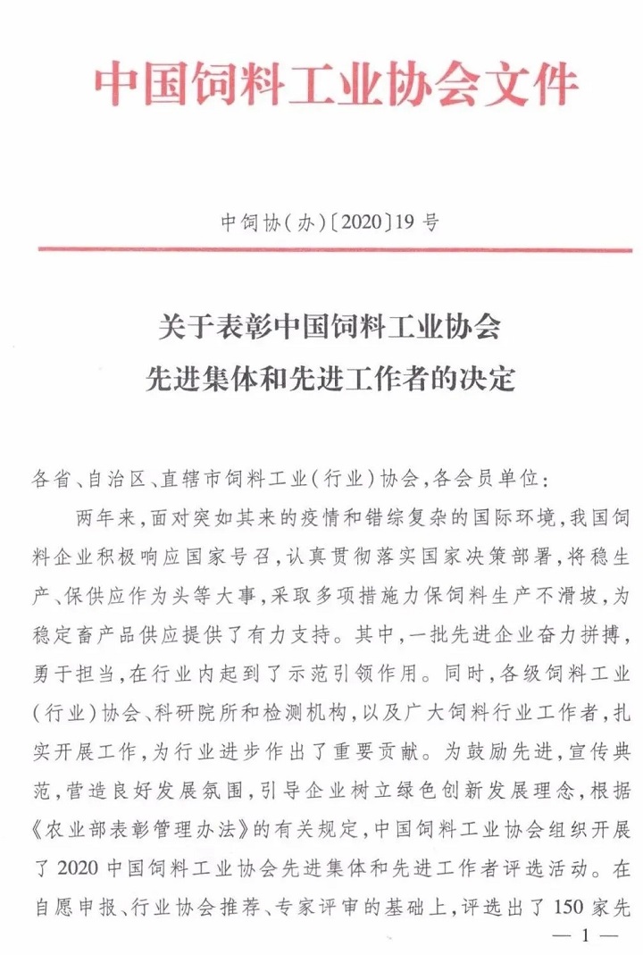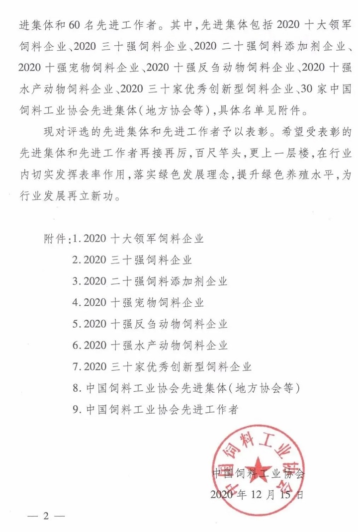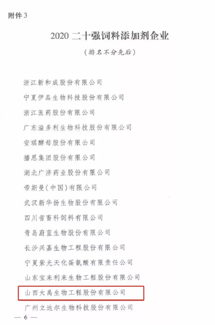 【喜訊】大禹生物榮獲2020全國二十強飼料添加劑企業稱號