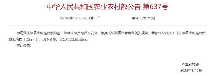 農業農村部公布《生豬屠宰肉品品質檢驗規程(試行)》